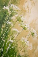 Dit schilderij vangt een vluchtig, bijna dromerig moment in de natuur: een zachte zomerwind die door een veld met wilde bloemen strijkt. Slanke groene stelen buigen licht mee met de beweging van de lucht, alsof ze samen dansen in een rustig ritme. De witte bloemschermen lijken te zweven boven het groen en vangen het licht als kleine…