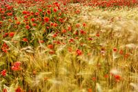 Gezicht op een gerstveld waarin talloze felrode klaproosbloesems groeien. Een langere belichtingstijd maakt zichtbaar hoe de zomerwind de aren in beweging zet - Locatie: Duitsland, Saksen