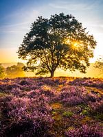 Soms heb je geluk als je over de heide loopt en zie je de zon prachtig opkomen achter een mooie boom. Het levert een mooi kleurenspel op.