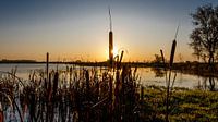 De opkomende zon verschuild zich net nog achter de pluim van de lisdodde. Een mooie ster tot gevolg.