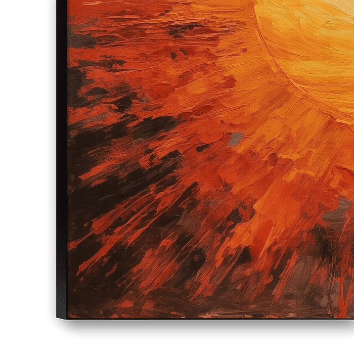 De harmonieuze balans tussen heldere gele tinten, vurige oranje accenten en subtiele nuances van rood en goud zorgt voor een levendige uitstraling die nooit verveelt. De compositie nodigt uit tot reflectie én bewondering, en voegt een vleugje creativiteit toe aan je interieur.