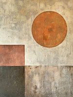 Een sfeervol tafereel waar een warme cirkelvorm boven geometrische vlakken zweeft. De aardetinten en minimalistische stijl zorgen voor een rustgevende balans.