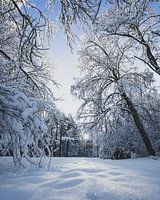 Koop de foto Zon door bomen in de sneeuw van Jonai als print op canvas, aluminium dibond, (ingelijste) fotoprint, behang en ArtFrame. Voor jou op maat geprint in Fine-Art kwaliteit.