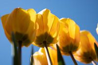 Van onder kijk je door de gele tulpen naar de zon en kleurt de gele tulp mooi op alsof hij licht geeft.tegen de helder blauwe lucht is het een mooi contrast.