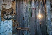De zon komt door een kier van een deur. Oud houten deur op het eiland van Sau Miguel, Portugal. Stenen brokkelen langzaam af. Straatfotografie met rauwe detail foto.