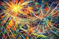 Een levendig schouwspel van door de zon beschenen spinnenwebben tegen een veelkleurige achtergrond. Het gebruik van licht en kleur creëert een dynamische en energieke scène.