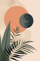 Zon en Maan - Een serene compositie die botanische elementen harmoniseert met abstracte vormen. Het Peach Fuzz kleurenpalet van zachte zalmroze tinten is speels vergezeld door diepe groen en grijsachtige tinten, waarbij de natuurlijke stilte wordt gevangen in een modern minimalistisch ontwerp.
