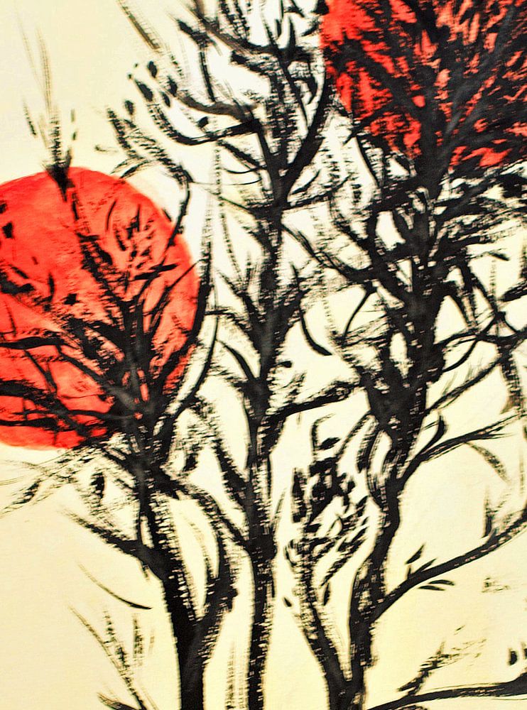 De zon en de maan staan samen aan de hemel. Hun rode kleur schijnt door de takken van de bomen. Zon en maan geven hun schijnsel aan de aarde waarvan wij allen mogen genieten . Aquarel met Oost-Indische inkt, geïnspireerd door de Japanse tekenkunst.