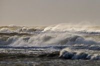 Zon schijnt op de branding van de Noordzee bij de buitenwatering van Katwijk. Golven rollen waarbij licht en wind opwaaiende druppels belicht bij zonsondergang met contrast rijke donkere achtergrond.