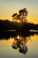 Zonsondergang Van Esschenven in de Oisterwijkse Bossen en Vennen. Eilandjes met bomen in de herfst. Prachtige weerspiegeling in een windstil water.