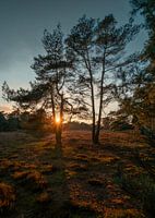 Het Deelerwoud is te vinden op de Veluwe en bestaat uit bos en heide. Dee foto laat de ondergaande herfstzon zien die tussen een gevorkte boom door haar laatste zonnestralen laat schijnen over de heide die daardoor een prachtige geelbruine tint krijgt. Dit werk straalt een een al al rust uit en is pur sang natuur zoals je die graag aan…