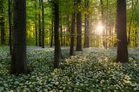 De zon stuurt haar stralen door het lentebos. De grond is bedekt met de bloesems van de ramsons.
