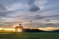 Zonsopgang bij de Wielenbach veldkapel bij Weilheim, Beieren, Duitsland.