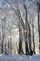 De zon schijnt door de besneeuwde beukenbomen. Een winterwonderland.
