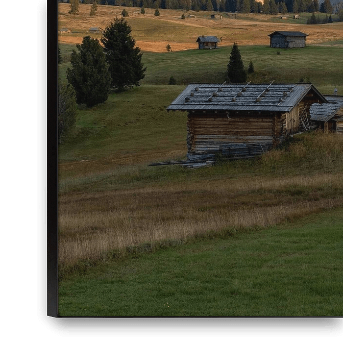 Zonsondergang bij de seiser alm in de dolomieten. de zon ging onder achter mij. het laatste licht raakte de bergwand en kleurt hem prachtig oranje. De vallei met de hutjes voor de berg geeft een prachtig beeld.