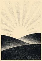 Een minimalistisch, monochroom kunstwerk toont een gele zon iets boven het midden van het beeld, waarvan de stralen als rechte, parallelle lijnen naar buiten lopen. Onder de zon bevinden zich twee zwarte, gebogen heuvelvormen. Het oppervlak van de zon is gestippeld en licht gestructureerd, de stralen lopen van lichtgeel naar wit. De…