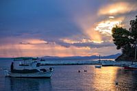 Zon en regen (in de verte) tijdens de zonsondergang tijdens de vakantie in dit mediterraanse paradijsje.