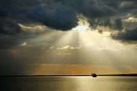 Zonsopkomst vanaf het strand in Rass al Hadd in Oman met een dramatische wolkenlucht. Waarbij de zonnestralen op het Omaanse schip, een dhow, schijnen.