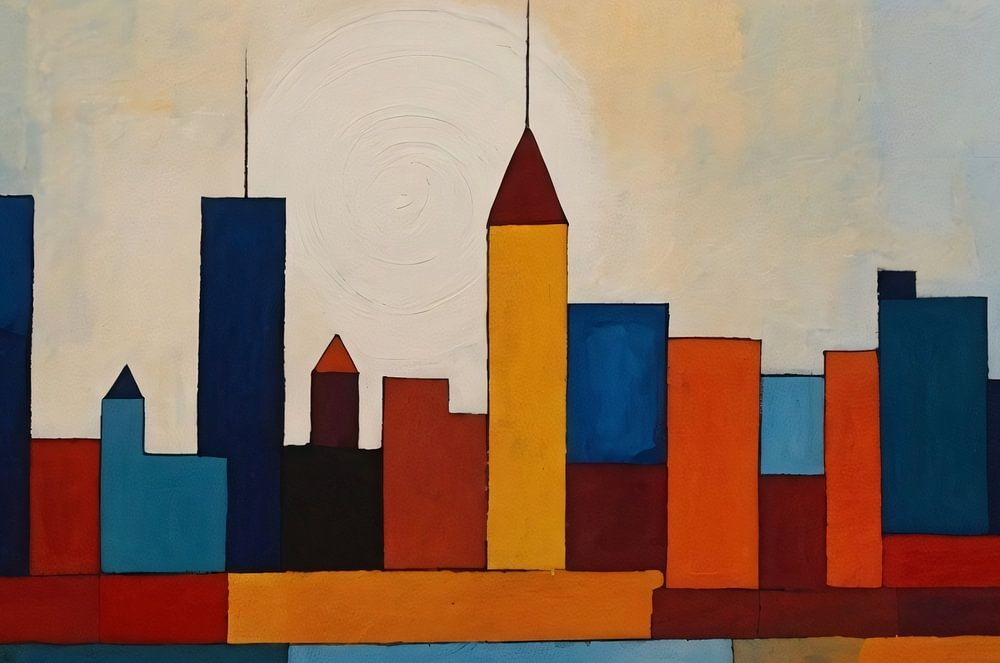 Duik in een wereld waar kleur en vorm samenkomen om een stedelijk panorama te creëren dat zowel modern als tijdloos is. Dit kunstwerk, dat speelt met abstractie, zet de essentie van een bruisende stad neer door middel van geometrische blokken en gedurfde kleuren. De gelaagdheid van warme en koele tinten doet denken aan de cycli van dag en nacht, terwijl een subtiele zon zich achter de skyline verschuilt en zo een zachte gloed over het tafereel werpt. Perfect voor de hedendaagse woonkamer of een stijlvol kantoor, dit stuk belooft een centraal gespreksonderwerp te zijn en een bron van inspiratie en contemplatie. Het nodigt de kijker uit om verder te kijken dan het canvas en de dynamiek van het stadsleven te overwegen. Elk gebouw, uitgebeeld in harmonieuze kleurvlakken, draagt bij aan een groter verhaal van gemeenschap en verbondenheid.