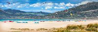 Zomers uitzicht op het strand van Tarifa in Andalusië / Spanje met zijn vele kiters en surfers. De foto is genomen op een prachtige zomerdag met blauwe luchten en een mooie lucht.