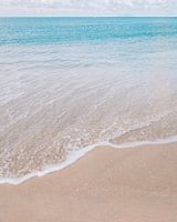 Deze serene foto toont een kalme branding die zachtjes over een goudkleurig zandstrand spoelt. Het water is kristalhelder en varieert van lichtblauw aan de kustlijn tot diepblauw in de verte.