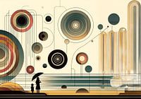 Surrealistische afbeelding van de zon, de zee, de wind en van zand. De abstracte figuren worden bekeken door de silhouetten van een meisje en een jongen met een paraplu. Het geheel is in allerlei kleuren afgebeeld. Het beeld is met behulp van ai gegenereerd.