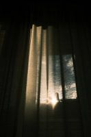 Het licht valt hier niet alleen, het filtert, rekt en buigt. Wat dit frame zo fascinerend maakt, is hoe de buitenwereld een suggestie wordt in plaats van een feit. Je kunt een raam voelen, misschien een dak, maar het gordijn verandert alles in een gelaagde herinnering. Het is doorschijnend genoeg om de scène erachter te laten zien, maar ondoorzichtig genoeg om het volledige verhaal achter te houden. Die zonnevlam in het midden werkt bijna als een hartslag, een hartslag van warmte in de schaduw.