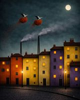 Twee witte vleugels doorkruisen de nacht, en laten klaprozen vallen als herinneringen. De huizen blijven verlicht, onbeweeglijk, met ramen die weten hoe ze moeten wachten. Rook stijgt langzaam op, als woorden die niet meer worden uitgesproken. En ze vliegen weg— zonder om te kijken.