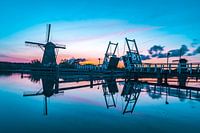 De molen bij de ophaalbrug in Kinderdijk tijdens de zonsondergang. De lucht kleur blauw roze en geel en het spiegelgladde water zorgt voor een adembenemende reflectie.