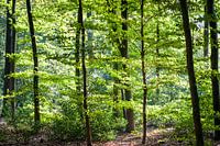Mooie zonnige morgen in het bos met strijklicht dat op de takken en de bladeren valt. Bomen met uitgelichte takken van het zonlicht in een Nederlands natuurpark.