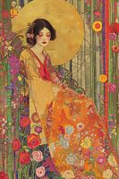 Kleurrijke afbeelding van een slapende vrouw op een stoel in een bloemenveld. Het heeft iets van een paradijs. Organische vormen en rechte lijnen wisselen elkaar af. Prachtige warme kleurstelling in geel, oranje, rood, paars, roze en groen. Mooie gele zon. Kimono. Japandi. Zomerse afbeelding. Passend bij diverse stijlen en trends. Artist: Bianca ter Riet. True Joy