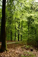 Een foto gemaakt in het bos van Emmen. Zonlicht valt op de verse beukenblaadjes en achterin het bos, in het midden van het beeld. Zo wordt je aandacht naar het midden van het beeld getrokken.