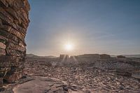 De zon staat laag boven de Sinaï-woestijn en werpt haar stralen over een landschap dat eeuwenlang onaangetast lijkt te zijn gebleven. Op de voorgrond, links in beeld, zie je de gestapelde lagen van een nawamis; een prehistorische ronde steenstructuur die vermoedelijk werd gebouwd tussen 4000 en 3150 voor Christus, in het chalcolithisch tijdperk.