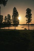 Koop dit landschapskunstwerk Zonlicht overspoelt het bos bij het meer met hutten, vredige natuurlijke idylle van Martin Köbsch op canvas, aluminium dibond, (ingelijste) fotoprint, behang en ArtFrame, op maat geprint in Fine-Art kwaliteit.