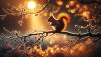 De winterzon schijnt door de takken en verlicht een rode eekhoorn die op een bevroren tak zit. Het licht breekt in de bevroren takken en geeft het tafereel een magische flikkering, alsof de boom een levend vuurwerk wordt. De eekhoorn, wiens vacht er warm en zacht uitziet in contrast met de koude omgeving, pauzeert om te genieten van het zeldzame geschenk van warmte in het kille seizoen. Het moment is vol stille bewondering voor de kleine wonderen van het leven, zoals zonnestralen die zelfs in het holst van de winter voor warmte kunnen zorgen.