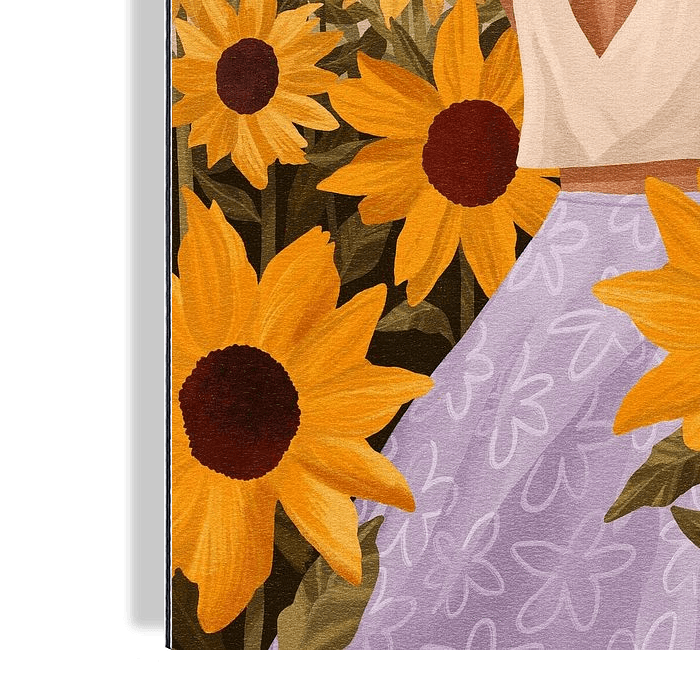 Romantische illustratie van een vrouw in een lila rok tussen de zonnebloemen met zonsondergang. Een zomeravond vol geur en kleur.