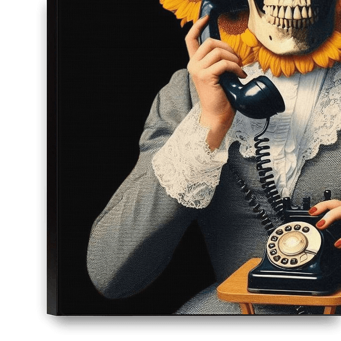 Een gedurfd schedelportret omlijst door heldere zonnebloemen tegen een donkere achtergrond. Het opvallende contrast tussen de levendige gele bloemblaadjes en de skeletachtige vorm zorgt voor een krachtige symbolische compositie.