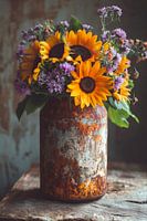 Stralende zonnebloemen gewikkeld in zacht paarse accenten dansen in een rustieke vaas waarvan het verweerde oppervlak verhalen vertelt van vervlogen tijden. Dit arrangement brengt een gevoel van warmte en natuur in de woonkamer, terwijl de levendige kleuren elke kamer vullen met vreugde en levendigheid. Perfect om een uitnodigende sfeer te creëren!