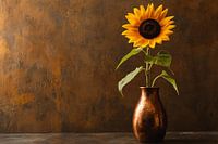 Deze prachtige foto toont een enkele zonnebloem met felgele bloemblaadjes in een stijlvolle koperen vaas. De achtergrond is donkerbruin en textuurrijk, wat de levendige kleur van de bloem en het warme koper van de vaas extra benadrukt. Het minimalistische en elegante ontwerp maakt het een perfecte toevoeging voor iedere ruimte, van…