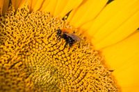 Een close up van een zonnebloem met een bij die zich tegoed doet aan het stuifmeel.