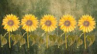 De vijf zonnebloemen stralen in hun gele pracht en lijken met elkaar te fluisteren in een harmonieuze dans van licht, natuur en nostalgie.