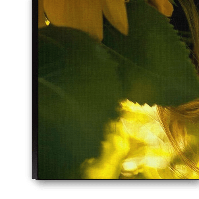Een delicaat vleugje zomer en levensvreugde omringt dit portret, waarin stralende zonnebloemen een natuurlijke kroon vormen. Het zachte licht en de levendige kleuren geven de kamer een warme, uitnodigende sfeer. Ideaal voor in de woonkamer om elke dag een beetje vreugde en frisheid te verspreiden.