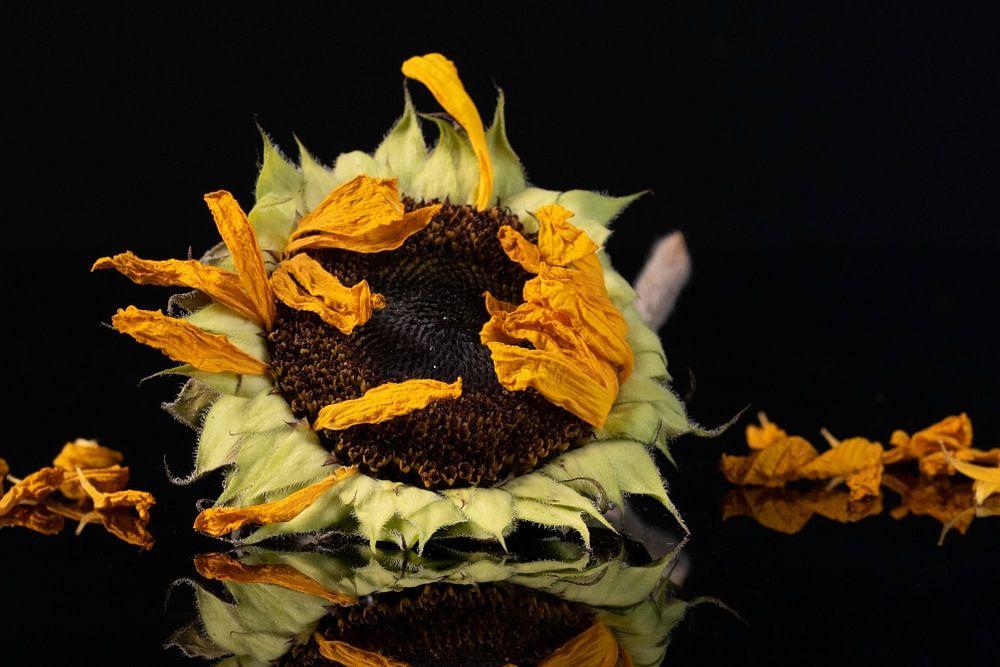 Een eens zo mooie zonnebloem ligt nu op haar sterfbed. Maar zelfs nu is ze nog mooi!
