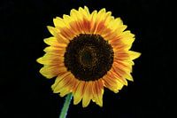 Zonnebloem tegen een zwarte achtergrond in zonlicht.Deze zonnebloem is geschoten met een macrolens op statief voor een beeldvullende opname.