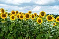 De zonnebloemvelden in Frankrijk zien er fantastisch uit in het donkere weer. De zonnebloemen richten zich naar de zon.