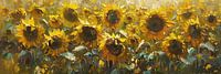 Dit werk toont een veld vol zonnebloemen, badend in het warme licht van de zomerzon. De zonnebloemen staan dicht bij elkaar, hun grote gele bloembladen stralen in verschillende richtingen. De achtergrond is subtiel, met hints van groen en blauw die de helderheid van de zonnebloemen versterken. Dit werk vangt de levendige energie van een zonnige zomerdag en brengt een gevoel van vreugde en warmte in elke ruimte.