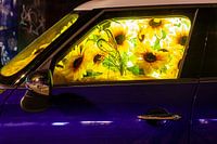 Verlichte zonnebloemen in een BMW Mini tijdens het GLOW lichtfestival 2014 in Eindhoven. Paars metallic BMW. Geel met groene zonnebloemen.