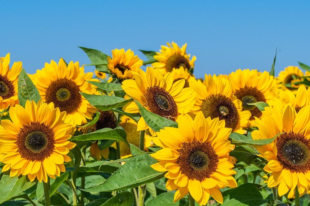 Een veld zonnebloemen tekent zich mooi af tegen een strak blauwe lucht, hierdoor krijg je een mooi kleurcontrast.