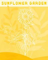 De illustratie toont een zonnebloem in volle bloei op de voorgrond, vergezeld van drie nog ontluikende zonnebloemen, allemaal met de hand getekend met alleen lijnen. Achter de bloemen gaan twee stengels met bladeren op in de achtergrond en vormen de indruk van omgevende planten.