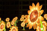 Zonnebloemen van Van Gogh, een ode aan het werk van schilder Van Gogh. Lichtgevende zonnebloemen in een donkere ruimte.